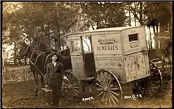 Rawleigh was very cognizant of the variety of salesmen who stopped at his home selling farm medicines, inspiring him to the overall potential that this type of operation provided. The combination of his incredible imagination, coupled with his natural organizational skills, pushed him to persuade his father to let him work for a neighbor as a farmhand for $20 a month in order to make money so he could get started selling farm medicines. By the end of the summer he had earned $120 and gave $100 of it to his parents. His father still objected to the idea of selling door-to-door, but by spring finally gave permission, though he refused to provide Rawleigh with money for freight and other starting expenses. He did, however; let him use a horse and helped him to buy a rig.[6] Inspired by the selling methods of the J.R. Watkins Medical Company, Rawleigh packed his clothes and departed to Stephenson County, Illinois.