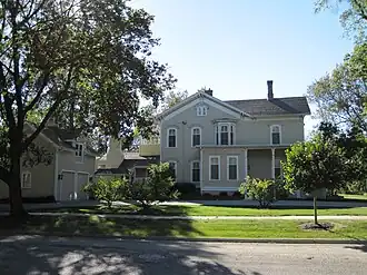 The house is on a 177-by-170-foot (54 m × 52 m) lot at the southwest corner of First Street and Park Avenue in Hinsdale. It is a wood-frame building, approximately 80 by 35 feet (24 m × 11 m). Most of the building is two stories; a section in the rear is only one story. This one-story section is a 1950s kitchen addition. A porch covers the front of the house, which extends to the east and west facades. The house features Italianate arch windows and cornice moldings. A two-car garage was added in 1988, replacing a 1950s garage. The second story has three evenly spaced windows on the north elevation. Two floor-length windows are found to the left of the double door entrance to the house. The doors are 9 feet (2.7 m) tall with rounded windows in the top panels. Side entrances are found along the east and west sides of the porch. A brick chimney rises through the roof. A basement runs under the entire house except under the east entrance. Basement walls are limestone blocks and irregular stones.