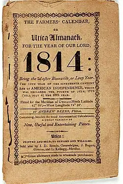 On August 11, 1814, Williams and Seward established a weekly newspaper, called The Utica Club, which was commonly called The Club. Edited by Henry Goodfellow, Esq. & Company, it ran from 1814 to 1815. Through their newspaper they advertised for "The Philadelphia Edition of the Edinburgh Encyclopedia" ..."just received by A. Seward at his book-store, and subscriptions are to be paid and called for by subscribers."[25][26] By 1818 Williams and Seward still continued to employ their newspaper in the advertising of the various works they had published.[27] Their business continued until 1824, when their partnership dissolved with the withdrawal of Seward, but the business in all its aspects continued for several years longer under Williams.[4] Williams also published his Williams's Calendar, and Andrew Beer's Utica Almanac.[19]