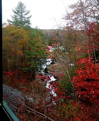 In Rockingham it is crossed by the Bartonsville Covered Bridge that was washed away in Hurricane Irene in August 2011, rebuilt in 2012, and reopened in January 2013,[7] as well as the Worrall Covered Bridge, the only 19th century covered bridge left in town. Below those bridges, it flows over Sokoki Falls, named for the local band of the Abenaki,[8] and through Brockways Mills Gorge.