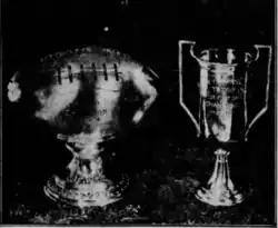 By November 17, 1924, the Defiance Bulldogs led the league with a 7–0 record, second was Shamrock, and third was South Side.[8] A possible deciding game on c. Dec. 1 between Defiance and South Side was called at 12–12 in total darkness. The teams protested the game and the arbitration board (George N. Boggs, Ben Greenstein (former president), and Joseph D. M'Laughlin) declared that the game would not count, due to errors in the officiating.[9] By week 12 the Defiance Bulldogs (10–1) and South Side-Eden Snappers (10–2) were tied for 1st due to the standings running on points rather than win-loss percentage.[10] A protest-play-off game was scheduled for January 3 between Defiance and South Side.[11][12] The game was postponed due to the field being covered in snow.[13] A meeting was held between the league officials a few days later.[14] The Snappers won a game against Defiance on c. March 29 in front of 1,200 fans, making another game necessary to decide the league champions.[15] Eventually the Shamrock A.C. were in position to play in the league championship and won against Defiance, 25 to 6.[16] The Shamrock A.C. were awarded two championship trophies, one provided by Bottomley and Company, and the other by Norman I. Harris Jewelers.[17]
