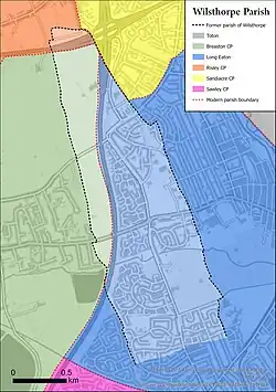 Wilsthorpe was a settlement in the Old Norse administrative area (known as the wapentake) of Morlestan or Morleystone. At c.1300, the wapentake merged with Litchurch and became the Hundred of Morleston and Litchurch.[6] In 1866, the parish amalgamated with Sawley to become Sawley and Wilsthorpe civil parish.[1] The John Marius Wilson "Imperial Gazetteer of England and Wales (1870-72)" states that at the time of publishing, the parish of Wilsthorpe had a population of 56[7] and the Kelly's Directory of Derbyshire of 1899 lists the Earl of Harrington as lord of the manor, and principal landowner.[8] By 1934, the Sawley and Wilsthorpe civil parish was abolished[1] and all lands were absorbed into Long Eaton's authority. Now part of Long Eaton, work immediately started on building the new Parkside estate, west of Trent College to Wilsthorpe road, resulting in the removal of the farms that were situated north of the Golden Brook on the eastern side of Wilsthorpe Road. After Parkside was built, only two farms remained of the original hamlet. Both these farms were situated on the western side of the crossroads; now locally known as the Wilsthorpe roundabout. In the late 1950s, houses were built on part of Wilsthorpe Farm, situated north of the road junction. In the mid 1960s, the western boundary of Long Eaton was adjusted to accommodate the arrival of the A52 and the M1 Motorway. Risley gained 17.6 acres (0.071 km2) of former parish land and Breaston gained 130 acres (0.53 km2) along the western side of the M1 motorway. Grange Farm (the last of the hamlet buildings) and its surrounding land on the south of the junction, was replaced by the Eaton Farm public house in the 1990s, and by 2013, all the rural land between Wilsthorpe Road, Pertersham Road (B6002) and the M1 Motorway, was fully developed by newbuild housing.[3][9]