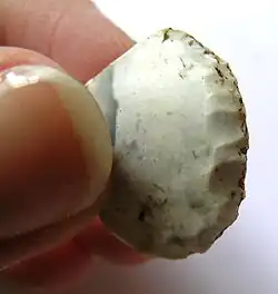 At the Wilton site, Hewitt first noted that this site contained remnants from two distinct cultures, distinguishable by the size of the stone tools. The stone preceding Wilton technology appeared much larger at the Wilton site. Based on the large size of the stone tools, Hewitt supposed that this material pertained to a predecessor of Wilton technology, known today as Oakhurst.[3] The significant component of Wilton sites is decreased tool size compared with Oakhurst and an increase frequency of stone scrapers.[1][2] Furthermore, the stone material at the Wilton rock shelter is predominantly Chalcedony.[2] This assemblage was dominated by stone scrapers and few backed tools. Scrapers were likely used for processing animal hides.[23][24] Backed tools were created by blunting one margin of the stone tool at a near-90 degree angle.[25] These backed tools were likely hafted to projectiles and served as barbs.[26] Archaeologists have used the assemblage at the Wilton rock shelter to define other Wilton-like assemblages throughout South Africa, Zambia, and Zimbabwe.[2][4][18]
