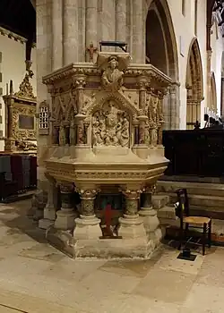 The organ was originally built in 1664 by Robert Hayward, of Bath. There are a number of ranks of pipes, still functioning in the present instrument, which date from this time. Originally, the organ stood upon a screen which separated the nave from the choir. However, in 1856 the organist at that time (Mr. F. Blount) removed the instrument and resited it in the south choir aisle. J. W. Walker & Sons rebuilt and enlarged the organ in 1866 and carried out further work in 1899, when a new case to house the Choir Organ was provided. This was designed by Walter J. Fletcher. In 1965, a major rebuilding and re-designing of the instrument took place, the work again being undertaken by J. W. Walker & Sons. The organ started being rebuilt by Mander Organ Builders in 2021 with a possible completion date of early 2022.[7] The project will see the instrument reorganised, with two new cases, a revised winding system and a new 32' pedal Sub Bass.