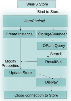 The WinFS API provides a class called the ItemContext class, which is bound to a WinFS store. The ItemContext object can be used to scope the search to the entire store or a subset of it. It also provides transactional access to the store.[15] An object of this class can then spawn an ItemSearcher object which then takes the type (an object representing the type) of the item to be retrieved or the relationship and the OPath query string representing the criteria for the search.[31][33] A set of all matches is returned, which can then be bound to a UI widget for displaying en masse or enumerating individually.[30] The properties items can also be modified and then stored back to the data store to update the data. The ItemContext object is closed (which marks the end of association of the object with the store) when the queries are made or changes merged into the store.