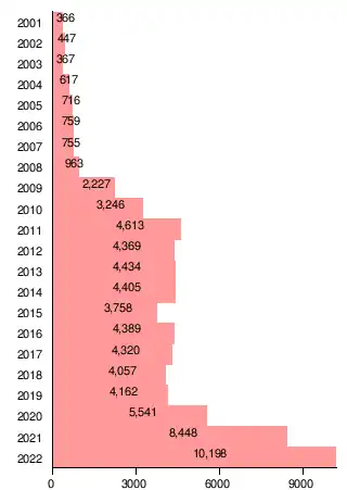 | 2003 | 44.855 | 32.632 | 47.914 | 23.440 | 24.315 | 19.253 | 11.672 | 13.782 | 22.393 | 34.624 | 43.916 | 47.683 | 366.479 |