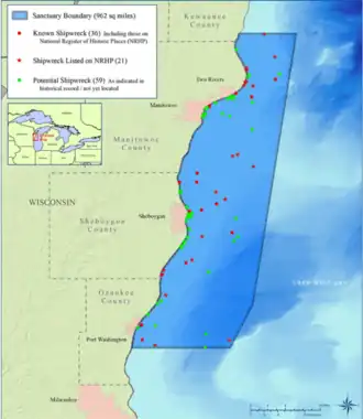 The Wisconsin Shipwreck Coast National Marine Sanctuary covers approximately 726 square nautical miles (962 sq mi; 2,490 km2)[3][4][5][6] in Lake Michigan off Wisconsin's Ozaukee, Sheboygan, Manitowoc, and Kewaunee counties.[4] It includes approximately 82 miles (132 km) of Wisconsin′s coast[4] and lies entirely within the state waters of Wisconsin,[4] extending approximately 7 to 16 miles (6.1 to 13.9 nmi; 11 to 26 km) from the coast.[4] Principal cities along the coast include Port Washington, Sheboygan, Manitowoc, and Two Rivers, Wisconsin.[4][6]