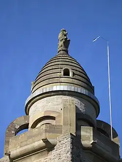 The Wittelsbacher Jubilee Tower has a total height of 33 metres. An observation deck is located at a height of 25 metres and, thus, approximately 245 metres above the valley of the Franconian Saale which can be viewed from the tower. A sculpture of a lion wearing a crown stands on the top of the tower. The Tower is made of Muschelkalk limestone while the lion sculpture, the front gate, the balustrade, and cupola consist of green sandstone.
