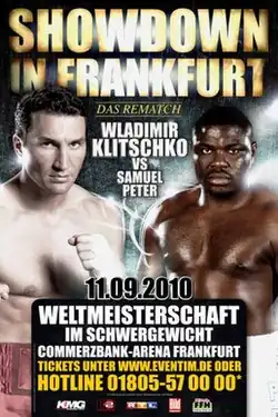 On 17 May, the 30-day period of negotiation began for Klitschko to defend his championship against Povetkin.[10] Within this period, discussions to make a fight with Haye were still ongoing.[11] In July 2010, it was confirmed that the bout would be taking place in Frankfurt,[12] with Samuel Peter replacing Povetkin for the scheduled fight as Povetkin failed to show up to the press-conference, deciding to pull out of the fight at the advice of his coach Teddy Atlas who believed Povetkin was not ready to face Klitschko.[13][14][15] This was the second time Povetkin had pulled out of a bout with Klitschko as they had been set to fight in December 2008, before he was replaced with Hasim Rahman.