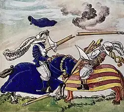 - ^ There were several different types of joust with varying objectives, which did not necessarily include unseating the opponent. They sometimes involved targeting specific points on the opponent's armour in order to trigger spring mechanisms with various spectacular consequences.[23] For example, in the case of the Geschiftscheiben-Rennen (the "joust of war" with "exploding shields") the aim was to strike a large roundel shield on the chest of the other rider. If the strike was correctly made, a complicated spring mechanism caused triangular metal segments attached to the surface of the shield to "explode" into the air.[24]