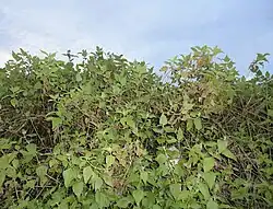 Despite the rough appearance of the plant, the leaves are edible.[7][8] In Malaysian cuisine the shoots are eaten cooked as a leaf vegetable and in Langkawi they are eaten raw with chilli and sambal shrimp paste. Leaves also have traditional medicinal uses as poultice or as decoction.[9][10]