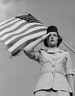 The first WAFs wore men's uniforms with neckties.[8] Geraldine Pratt May quickly ordered women's uniforms, selecting herself the particular shade of blue. The cut of the winter uniform was modeled after those of airline flight attendants, using the same material as the men's winter uniforms. Instead of a necktie, tabs were worn on the collar. The effect was considered "smart and contemporary",[8] The two-piece summer uniform, however, made of cotton-cord seersucker, fit poorly and required frequent ironing.[8]