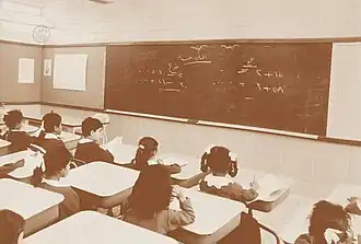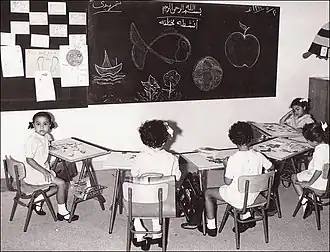 Girls' education in Saudi Arabia was not formally addressed by the government until 1959.[7] Women's education in Saudi Arabia was always thought of differently than that of men. The Quran teaches that the role of education for women is to serve as a guide on how to become the best wife they can be. This is due to the preconceived notion that women are meant to be mothers, nurturers, and housewives.[8] Before public schools for girls were opened, women born into wealthy families could access education via in-home tutoring. In 1941, the first private school for girls was opened by Indonesian and Malawian immigrants, called Madrasat AlBanat AlAhliah.[7] The first girls' public school was established in 1956 in Riyadh, called Dar Al Hanan.[9] A large portion of the Saudi Arabian population was opposed to the implementation of women's education policy; in September 1963, the government had to deploy officials to forcibly restrain citizens in Buraydah who were protesting girls' education.[9] According to Natana Delong-Bas, the suppression of women's education by contemporary Wahhabi regimes is due to their adherence to a specific interpretation of Wahhabi Islam.[1]
