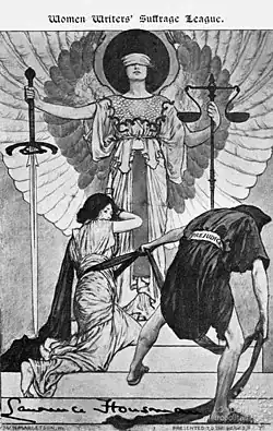 The Women Writers' Suffrage League (WWSL) was an organisation in the United Kingdom formed in 1908 by Cicely Hamilton and Bessie Hatton.[1] The organisation stated that it wanted "to obtain the Parliamentary Franchise for women on the same terms as it is, or may be, granted to men. Its methods are the methods proper to writers โ the use of the pen."[2] The organisation viewed itself as a writers' group rather than a literary society.[3] Membership was not based on literary merit, but instead was granted to anyone who had published and sold a written work.[3] Members also paid an annual subscription fee of 2s. 6d.[4] The league was inclusive and welcomed writers of all genders, classes, genres, and political persuasions provided they were in favor of women's suffrage.[3] By 1911 the league was composed of conservatives, liberals and socialists, women of power and women who worked hard and members of the military.[5] The league disbanded on 24 January 1919[3] following the passing Representation of the People Act in February 1918, granting women over the age of 30 the right to vote.[6]