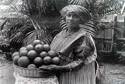 ![]() A Surinamese woman holding a basket full of fruits. Picture taken sometime within 1904–1937. | |