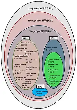 Duke Byuljwa faction(別坐公派): The eldest son of Hyun(顯), Kukchung (克忠, 1434- ?) lived in Yangju, Gyeonggi Province since Anyeol, the founder of the Wonju Byun clan. He lived in Incheon (仁川) since Cheoryeong (處寧), the 4th generation of the Wonju Byun clan. Duke Chamui faction (參議公派): Hyun(顯)’s second son, Kukmin (克愍) lived in Taecheon, Pyeongan Province. He lived in Taein (泰仁), North Pyongan Province, starting from Jaejung (載重) of the 4th generation of the Wonju Byun clan.