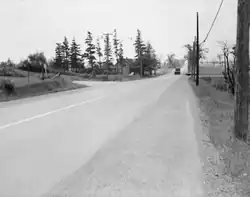 Woodbine was a single lane paved concession road (third concession line laid 19,800 ft (6,000 m) east of Yonge Street, with the northern section running to south of York Mills Road with an unopened road allowance extending southwards to beyond Lawrence Avenue.[4][5] An abandoned stub of the old road south of York Mills Road remains behind a fenced off wooded area on the east side of the Don Valley Parkway where the parkway crosses a ravine.