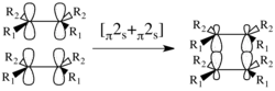 The Woodward–Hoffmann rules can also explain bimolecular cycloaddition reactions through correlation diagrams.[26] A [πp + πq] cycloaddition brings together two components, one with p π-electrons, and the other with q π-electrons. Cycloaddition reactions are further characterized as suprafacial (s) or antarafacial (a) with respect to each of the π components. (See below "General formulation" for a detailed description of the generalization of WH notation to all pericyclic processes.)