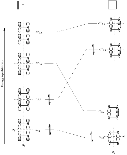 This is made precise in the state correlation diagram below.[17][25] The ground state in the starting materials is the electronic state where πSS and πAS are both doubly populated – i.e. the state (SS)2(AS)2. As such, this state attempts to correlate with the electronic state in the product where both σSS and σ*AS are doubly populated – i.e. the state (SS)2(AS)2. However, this state is neither the ground state (SS)2(SA)2 of cyclobutane, nor the first excited state ES-1'=(SS)2(SA)(AS), where an electron is promoted from the HOMO to the LUMO.