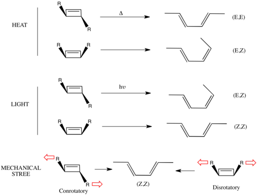 Similarly, a recent paper describes how mechanical stress can be used to reshape chemical reaction pathways to lead to products that apparently violate Woodward–Hoffman rules.[37] In this paper, they use ultrasound irradiation to induce a mechanical stress on link-functionalized polymers attached syn or anti on the cyclobutene ring. Computational studies predict that the mechanical force, resulting from friction of the polymers, induces bond lengthening along the reaction coordinate of the conrotatory mechanism in the anti-bisubstituted-cyclobutene, and along the reaction coordinate of the disrotatory mechanism in the syn-bisubstituted-cyclobutene. Thus in the syn-bisubstituted-cyclobutene, the anti-WH product is predicted to be formed.