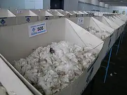 In December 2004, a bale of the then world's finest wool, averaging 11.8 microns, sold for AU$3,000 per kilogram at auction in Melbourne. This fleece wool tested with an average yield of 74.5%, 68 mm (2.7 in) long, and had 40 newtons per kilotex strength. The result was A$279,000 for the bale.[29] The finest bale of wool ever auctioned was sold for a seasonal record of AU$2690 per kilo during June 2008. This bale was produced by the Hillcreston Pinehill Partnership and measured 11.6 microns, 72.1% yield, and had a 43 newtons per kilotex strength measurement. The bale realized $247,480 and was exported to India.[30]