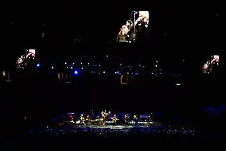The American third leg began in mid-August with shows at outdoor amphitheaters as well as indoor arenas. Shows were often scheduled for weekends, to allow Max Weinberg to play without missing any Tonight Show time; Jay Weinberg played those shows held during the week. Then on September 25, Max Weinberg took a two-month absence from the television show, to join Springsteen for the final portion of the leg. Ticket sales were slower than normal on this leg, partly due to Ticketmaster's new "paperless ticketing" system that may have come into effect due to the earlier problems with Springsteen sales.[116] In arenas that did not sell well, management relocated the people who bought tickets behind the stage to other sections and put up the screen used for stadium and amphitheater shows behind the stage. In a hint to fans to buy up, Van Zandt said, "You never know. This could be the last tour. We do every show like it's our last show anyway."[117] In any case, by September 2009 the tour had sold over two million tickets overall.[117] Even some shows in Philadelphia, long a Springsteen bastion, were not sold out.[118]