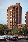 This was followed, in early 70's, by the red brick towers of the World's End estate which swept away many Victorian terraced houses.[6] The estate was designed by Jim Cadbury-Brown and Eric Lyons,[2] and is now known for its brutalist architecture.[7]