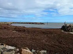 It consists largely of species of Fucus — brown seaweeds with flat branched ribbon-like fronds, characterized in F. serratus by a saw-toothed margin and in F. vesiculosus, another common species, by bearing air-bladders. Another component of sea wrack may be seagrasses such as Zostera marina a marine flowering plant with bright green long narrow grass-like leaves.[2] Posidonia australis, which occurs sub-tidally on the southern coasts of Australia, sheds its older ribbon-like leaf blades in winter, resulting in thick accumulations along more sheltered shorelines.