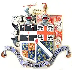 Arms of Wrey Baronets, with quarterings and crests, as seen on mural monument in Tawstock Church, Devon, to Sir Philip Bourchier Sherard Wrey, 12th Baronet: Quarterly: 1st: Sable, a fesse between three pole-axes argent helved gules (Wrey);'[1] 2nd: Argent, a cross engrailed gules between four water-bougets sable (Bourchier); 3rd: Within a bordure argent the Royal Arms of England (Plantagenet); 4th: Azure, a bend argent cotised or between six lions rampant or (de Bohun). The last two quarterings refer to the wife of William Bourchier, 1st Count of Eu (d.1420), namely Anne of Gloucester, Countess of Stafford, the daughter of the Plantagenet prince, Thomas of Woodstock, 1st Duke of Gloucester by his wife Eleanor de Bohun elder daughter and coheiress of Humphrey de Bohun, 7th Earl of Hereford (1341–1373), Earl of Essex and Northampton. Over-all is the Red Hand of Ulster. Above the shield in the centre is a Bourchier knot or. Above the dexter is the crest of Wrey: A cubit arm embowed holding a pole-axe argent helved gules, on the sinister side is the crest of Bourchier: A man's head in profile proper ducally crowned or with a pointed cap gules[2] On a scroll underneath the motto of Bourchier: Le Bon Temps Viendra ("The right time will come")