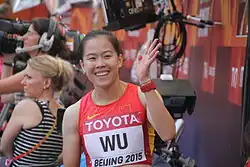 She opened 2013 with a 60 m hurdles best of 8.19 seconds in Nanjing.[7] Her first outdoor competition that year saw her run 13.08 seconds,[8] and she established her supremacy among Chinese hurdlers that year by taking her second national title. This earned her a debut appearance 2013 World Championships in Athletics, but she failed to get past the heats of the global level event.[9] At the 12th Chinese Games she beat two-time Asian champion Sun Yawei to take the hurdles gold medal in a new best of 12.96 seconds. She also helped the Guangdong team to third in the relay race.[10] Wu closed the year with a gold medal at the 2013 East Asian Games in a Games record of 12.93 seconds – a time that ranked her as the top Asian hurdler that year.[11] Wu has been banned after testing positive in June 2018 for norandrosterone. Wu is banned until July 2022 and her coach Dai Jianhua received a two year ban.[12]