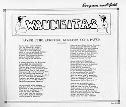 The name, culture, and traditions of the Wuaneita Society are heavily appropriated from stereotypes of Cree culture; the women often called themselves "Tribe Wuaneita".[3] The name Wuaneita is a rough equivalent to the Cree word meaning "kind-hearted".[2] Initiation ceremonies featured First Nations accoutrements like feathers and headdresses, and initiates were welcomed using a "blanket of friendship" that would be draped over each woman's shoulders by the "Big Chief," the society president.[2] The motto of the group was "payuk uche kukeyow, mena kukeyow uche payuk," a rough translation into Cree of "all for one, one for all" that is still engraved above the outer doors of Pembina Hall on main campus.[7]