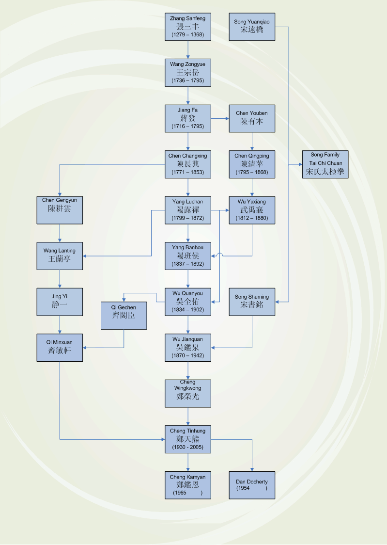 The Wudang tai chi system teachers publish that they have links to famous tai chi masters (see lineage diagram), including Yang Banhou, Wu Quanyou, Wu Jianquan, Cheng Wing Kwong, Chen Gengyun (陳耕雲) and Wang Lanting (王蘭亭).