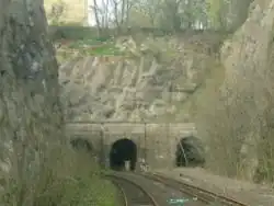 Another notable structure is the Rauenthal Tunnel in Wuppertal, through which the railway runs between Oberbarmen and Ronsdorf under a mountain range and the residential area located on it. Two parallel tunnel tubes were cut through the mountain for the double-track line.