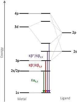 High-resolution scans of these lines can determine the exact energy level and structural configuration of a chemical compound. If we ignore every transfer that does not affect valence electrons, there are only two major electron transfer mechanisms. If we include the chemical compounds of 3d-transition metals, which can either be high-spin or low-spin, we get 2 mechanisms for each spin configuration.[6]