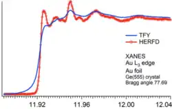 In synchrotron facilities, that measurement can be done at the same time. Yet, the experiment setup is quite complex and needs exact and fine-tuned crystal monochromators to diffract the tangential beam coming from the electron storage ring. The method is called HERFD, which stands for High Energy Resolution Fluorescence Detection. The collection method is unique in that, after a collection of all wavelengths coming from "the source" called , the beam is then shone onto the sample holder with a detector behind it for the XANES part of the measurement. The sample itself starts to emit X-rays, and after those photons have been monochromatized, they are collected, too. Most setups use at least three crystal monochromators or more. The is used in absorption measurements as a part of the Beer-Lambert Law in the equation