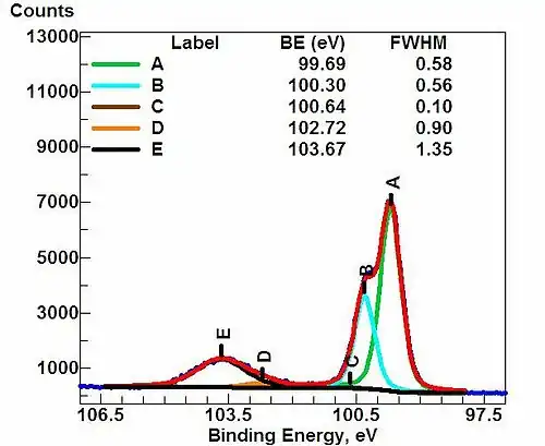 Chemical state analysis of the surface of a silicon wafer reveals chemical shifts due to different formal oxidation states, such as: n-doped silicon and p-doped silicon (metallic silicon), silicon suboxide (Si2O), silicon monoxide (SiO), Si2O3, and silicon dioxide (SiO2). An example of this is seen in the figure "High-resolution spectrum of an oxidized silicon wafer in the energy range of the Si 2p signal".
