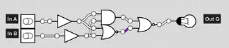 The two leftmost transistors mentioned above, perform an optimized conditional inversion of A when B is at a logic high using pass transistor logic to reduce the transistor count and when B is at a logic low, their output is at a high impedance state. The two in the middle are a transmission gate that drives the output to the value of A when B is at a logic low and the two rightmost transistors form an inverter needed to generate used by the transmission gate and the pass transistor logic circuit.[9]