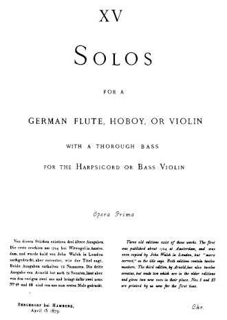 XV Solos for a German Flute, Hoboy, or Violin with a Thorough Bass for the Harpsichord or Bass Violin was published by Friedrich Chrysander in 1879. The 72-page volume contains sonatas, for various instruments, composed by or attributed to George Frideric Handel. The words on the cover of the publication are: Sonate da Camera di G.F.Handel. The publication includes all the sonatas as published by Walsh in 1732; and those sonatas, as well as extras included by Chrysander, include the body of work that is known as Handel's "Opus 1".[1]