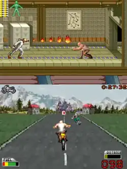 Some levels involve xXx riding a motorcycle and engaging in hand-to-hand combat with enemy riders. The motorcycle has a limited amount of fuel, which can be replenished by collecting fuel canisters scattered along the road,[3] and can take only a certain amount of damage before it is destroyed.[7] A bar indicating the player's remaining distance to the end of the level is placed at the bottom-right corner of the screen.[7]