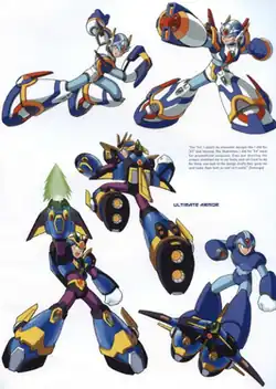 Hitoshi Ariga designed X's secret "Ultimate Armor" (アルティメットアーマー, Arutimetto Āmā) for the fourth title of the game, available only after inputting a cheat code, and for a corresponding Japanese Bandai action figure under the term "Mega Armor".[60] He was given four days to complete the design, and after finishing the design for the in-game parts, his supervisor told him to start over. After tinkering with the X3 Mega Armor parts, he noticed that attaching them in specific ways made them look like an airplane, which gave him the ideas he needed to complete the project, resulting in a special technique called Nova Strike (ノヴァ・ストライク, Nova Sutoraiku) where X dashes like a plane. Ariga recalled creating the armor as a difficult yet fun task, and he revealed that Zero was intended to have a similar set of armor which did not get released at the time.[60] Artist Ryuji Higurashi designed X's new Falcon Armor (ファルコンアーマー, Farukon Āmā) for X5, wanting it to resemble a bird with a beak-shaped chest piece, wings coming out of the back, and a talon-like arm cannon. Suetsugu designed the Gaea Armor, which was meant to resemble Sanagiman from the Inazuman manga series.[50] In Mega Man X6, Suetsugu aimed to make the Blade and Shadow Armors look stylish.[61] Another armor based on the Ultimate's design was made for X to wear in Mega Man X Legacy Collection's "X Challenges" mode.[62] The three main characters were revised for Mega Man X8 as Yoshikawa wanted to give them more unique features to contrast their personalities.[63]
