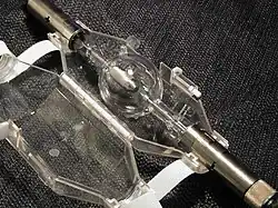 Following these developments, the first successful public projection using xenon light was performed on 30 October 1950, when excerpts from a colour film (Schwarzwaldmädel) were shown during the 216th session of the German Cinematographic Society in Berlin.[5] The technology was commercially introduced by German Osram in 1952.[6] First produced in the 2 kW size (XBO2001), and the 1 kW (XBO1001)[7] these lamps saw wide use in movie projection, where they replaced the older, more labor-intensive (to operate) carbon arc lamps.