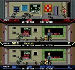 Xenophobe is an action game. The goal of each level is to defeat all the aliens before a countdown timer runs out. Some rooms routinely display the percentage of alien infection and time remaining until self-destruct when the level ends (but a nearby button can temporarily deactivate the count-down). Levels may contain more than one floor, and players use elevators to move between floors. Players can also pick up more powerful weapons to help in their eradication of the aliens.[3]