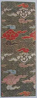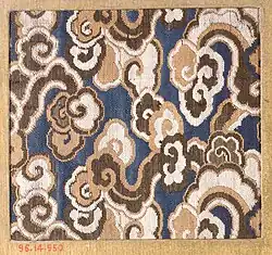Xiangyun are one of the most auspicious patterns used in China and have a very long history.[5] Clouds motifs have appeared in China as early as the Shang dynasty and Eastern Zhou dynasty.[1][2][3]: 132 [6]: 25 They are one of the oldest decorations and ornaments used in Chinese art, Chinese architecture, furniture, and Chinese textile and Chinese clothing.[6]: 25 [7][2]: 579–582 When used on Chinese textile, xiangyun can take many various forms, including having the appearance of Chinese character wan (卐; wàn) or the appearance of the lingzhi.[2]: 582 [4][note 2] Xiangyun motif has been transmitted from generation to generation in China and is still valued in present days China for its aesthetic and cultural value.[5][7] Xiangyun was also introduced in Japan, where it became known as zuiun.[8]
