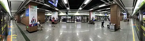 During COVID-19 pandemic control rules from 29 May to 24 June 2021, the station's services had been largely restricted, as from 29 May the station only allowed exiting,[5] and from 7 June all entrances/exits effectively closed, which meant that passengers couldn't embark or disembark at this station,[6] and while the trains on both lines can still stop here, passengers can only transfer between both lines within the fare zone. All entrances have been reopened in the afternoon of 24 June.[7]