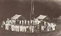 In 1914 the Board of Trustees of the Youngstown YMCA adopted a permanent policy of conducting a summer camp for boys. The campsite in 1914 was established at Cannon's Mills on Little Beaver River. Land for the camp was donated by John H. Fitch in addition to a sum of money sufficient to operate the camp for a five-year period.[2] Thirty-two campers were enrolled for the first year, and the camp continued to operate at that site for the summers of 1915, 1916 and 1917. During these first years, a common fashion accessory for campers was a forked stick; these had to be carried for protection due to the abundance of rattlesnakes and copperheads in the area.[1] Fortunately, this reptilian problem was rectified through the relocation of the camp grounds.
