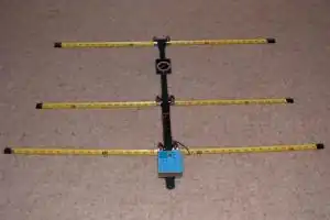 A portable Yagi–Uda antenna for use at 144 MHz (2 m), with segments of yellow tape-measure ribbon for the arms of the driven and parasitic elements.