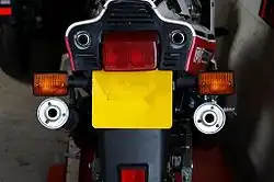 The RD500LC uses twin ventilated disc brakes for the front wheel with a single ventilated disc at the rear. A solo seat cowl was originally provided to cover the pillion seat when not in use.[1] The Japanese market RZV500R differs from the RD500 by not having a rear-mounted pillion grab handle fitted (which gives a cleaner, more race-oriented look to the motorcycle).