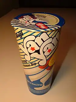 Yan Yan (ヤンヤンつけボー, Yan Yan Tsukebō) is a Japanese snack food made by Meiji Seika since 1979. It comes in a package with two compartments. One side has biscuit sticks (which can be sometimes called cracker sticks), the other side has chocolate, strawberry, vanilla, or yogurt flavored frosting used for dipping. The sticks themselves may also be flavored. Some Yan Yan products are sold in rectangular containers with 9 sticks and dip. There is also a new version which includes two flavored dips.[1]