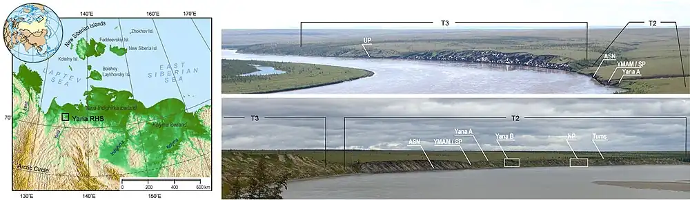 The Yana RHS is located on an alluvial terrace near the left bank of the Yana river, north of the Arctic Circle, around 100 km south of the current river mouth.[5] It is situated on the far west of the coastal lowland between the Yana River in the west and the Kolyma River in the east.[9] The site consists of a complex of several roughly contemporaneous locations, separated by tens or hundreds of metres, over an area of more than 3500 square metres.[6][9] The cultural layer is retained to a significant extent at three of these locations (Northern Point, Yana B, and Tums1). Three other locations (Upstream Point, ASN, and Southern Point) only yield surface finds. At an additional location, now known as 'Yana Mass Accumulation of Mammoth' (YMAM), a large number of mammoth remains, comprising over 1,000 mammoth bones, was discovered in 2008 by ivory hunters.[6]