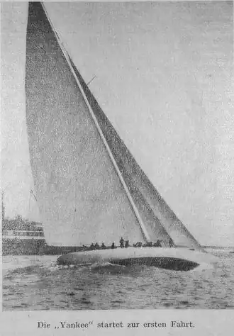 Her construction was of steel frames and deck beams, with wooden decks and a hull was built from very expensive Tobin bronze.[1][2] Her launch was delayed because she was being built behind and in the same shed as Whirlwind,[3] another contender for the defense of the Cup. Inspectors from Lloyd's required significant structural changes to that boat, which in turn blocked Yankee's completion.[3] She was eventually launched on May 10.[3]